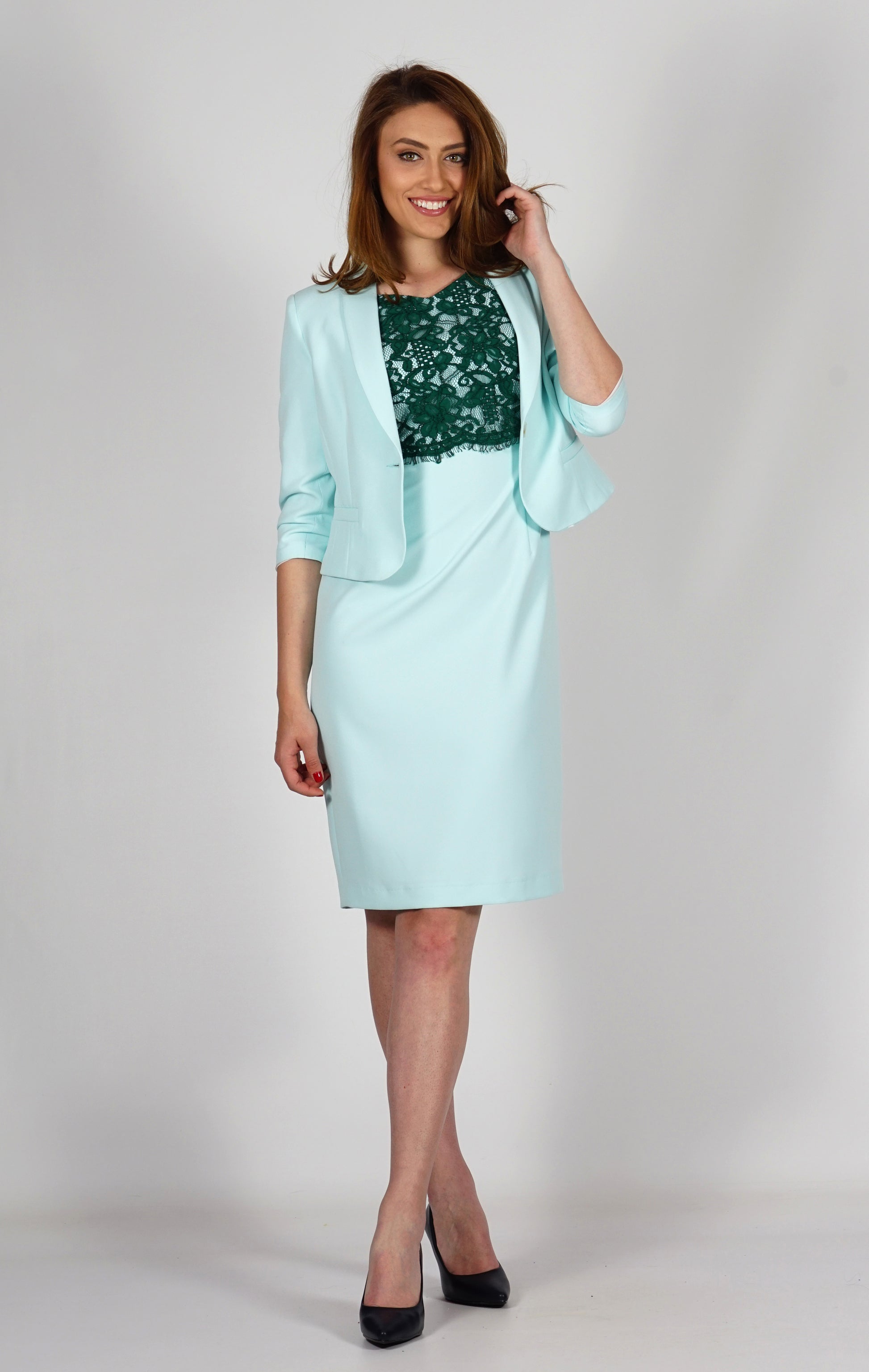 Едно нестандартно, смело и в същото време много стилно решение за Вашите празници.  Материалът е с комфортна еластичност в двете посоки, което го прави много удобен. Роклята е с втален,  прав силует. В горната и част тъмно зелена дантела покрива основния светъл цвят като при ръкавите ръката е покрита само от дантелата. Сакото също е с втален силует. Дължината му е къса, за да подчертае линията на роклята. Ръкавите са кокетни три-четвърти, а реверът е шал яка. Цветът е много нежно бледо пастелно зелено, което ние сме нарекли цвят мента. Сетът е подходящ за всяка фигура. Този официален костюм е подходящ не само за Вашите празници, но и за делови случаи, които изискват да сте елегантна.