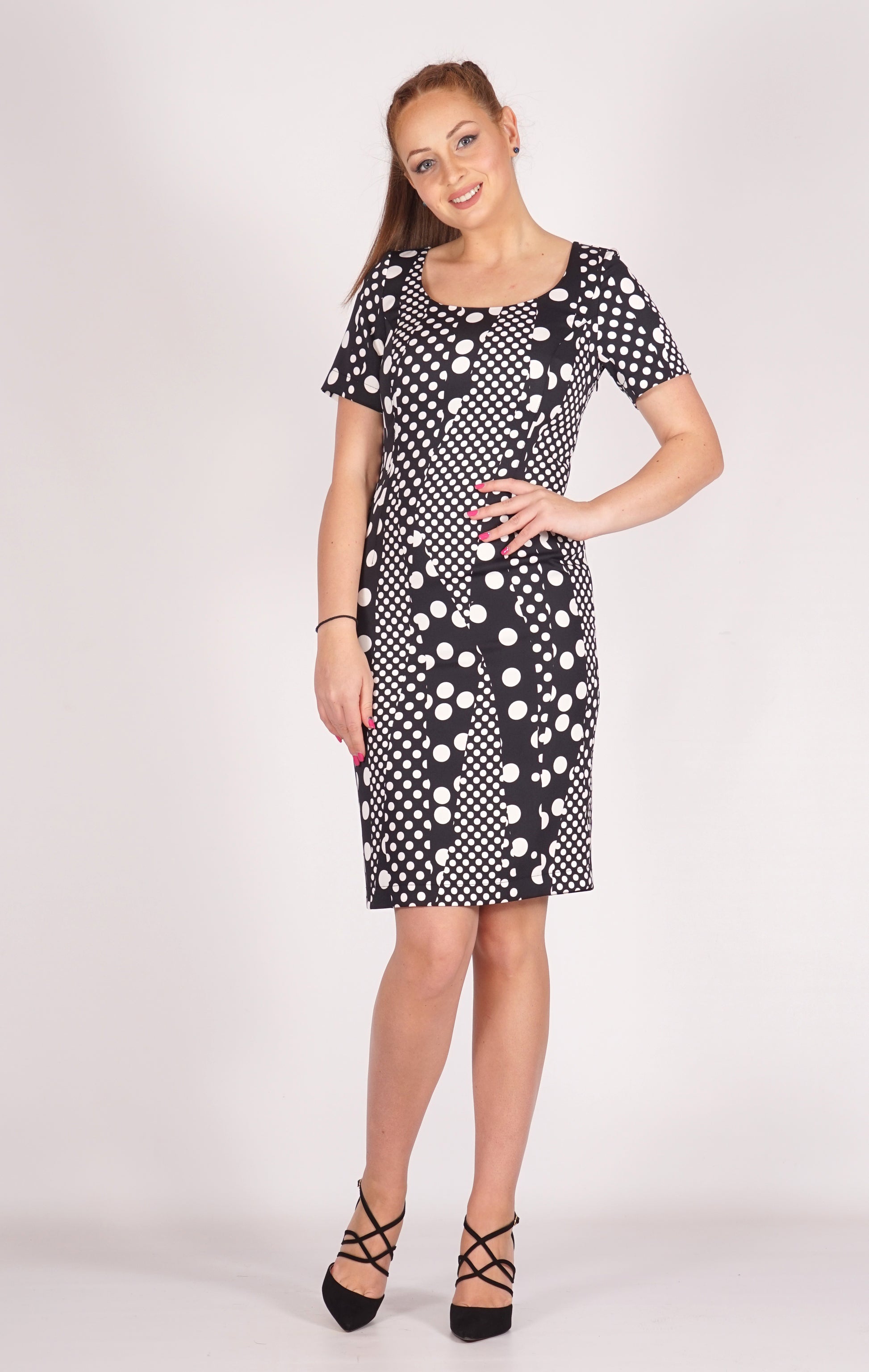 Елегантна дамска рокля в класическото и никога не остаряващо съчетание на черно и бяло в класически, но разчупен вариант на точки в различни големини. Много стилен принт, който е подходящ както за всекидневен тоалет, така и за официални случаи, когато искате да сте много стилна без излишно да се набивате на очи. Но сме сигурни, че ще Ви поздравят за оригиналния избор. Роклята е с втален силует, къс ръкав, подходящ . Изпращаме с опция преглед и тест. Лесно връщане и замяна.