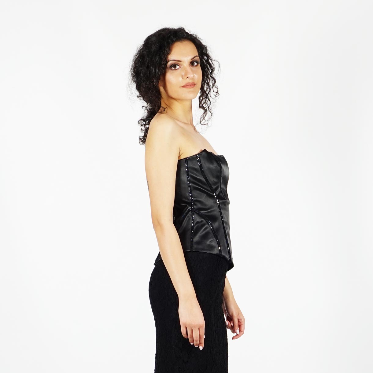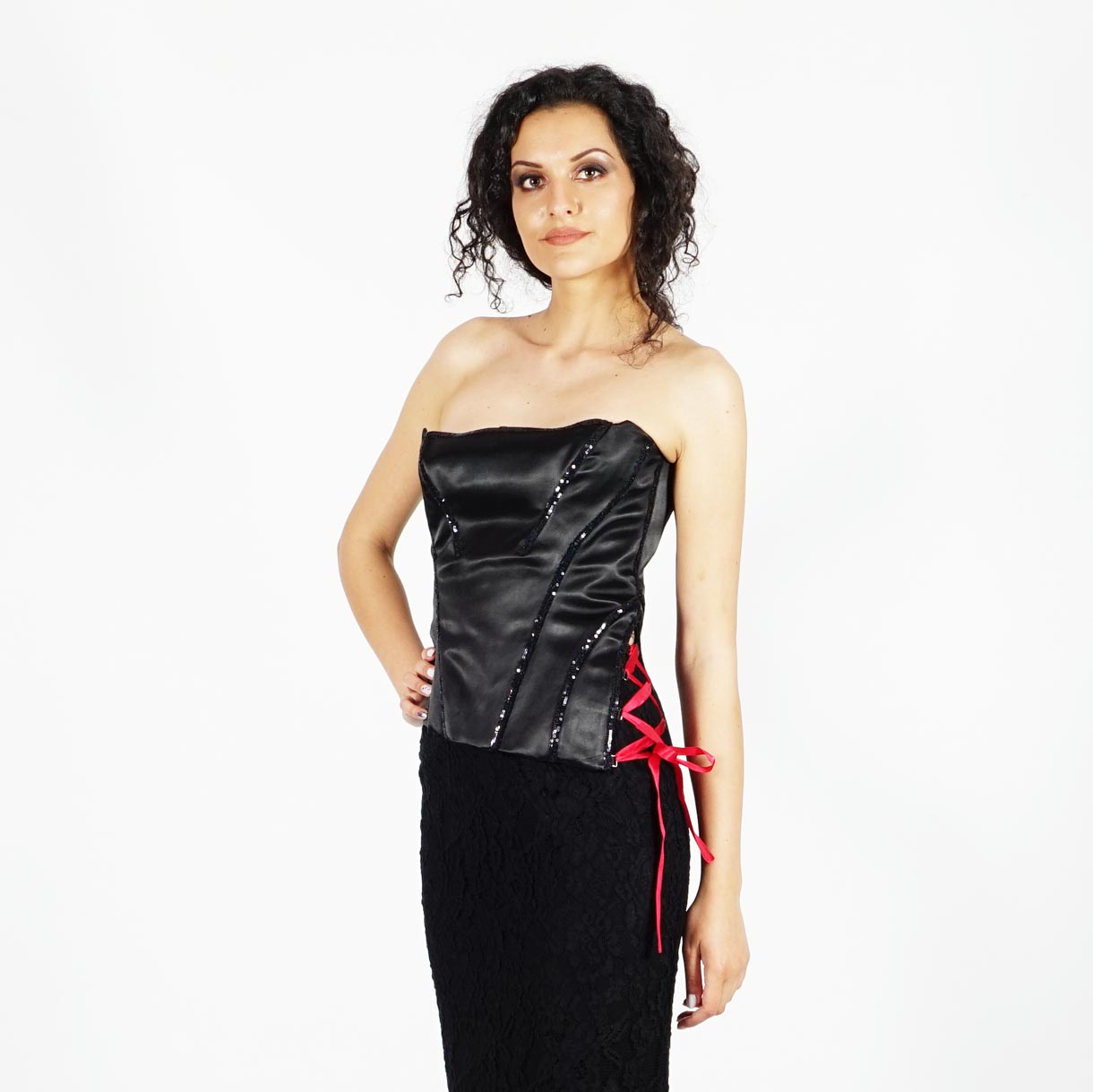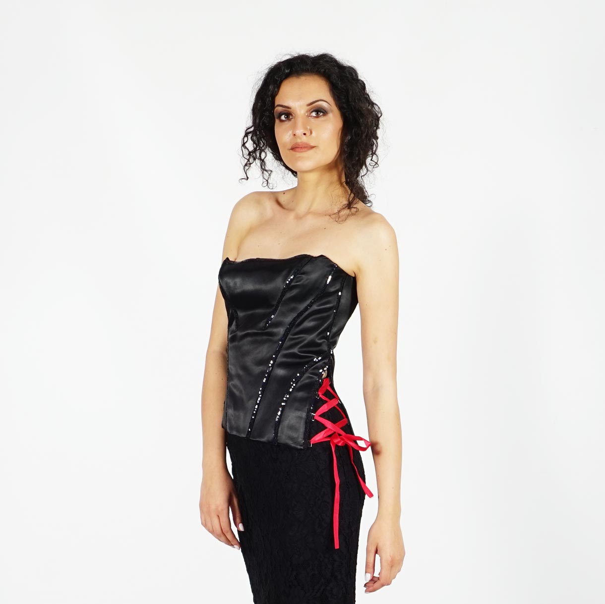 Официаленият бутиков черен дамски корсет е от еластичен черен луксозен италиански сатен украсен с ленти от черни пайетки по деколтето и по линиите на срязване и с червена сатенена панделка в страничната регулация. Има класическата за дамски корсет регулация на гърба, която оформя и намалява талията. Корсетът има и подвижни подплънки за повдигане и уголемяване на бюста.