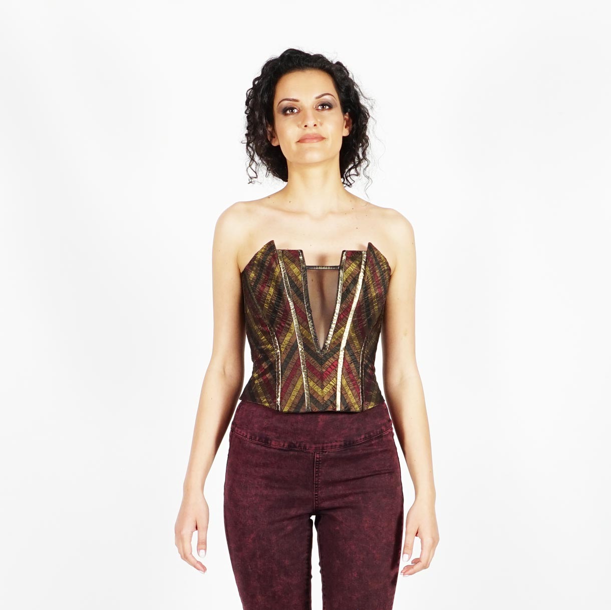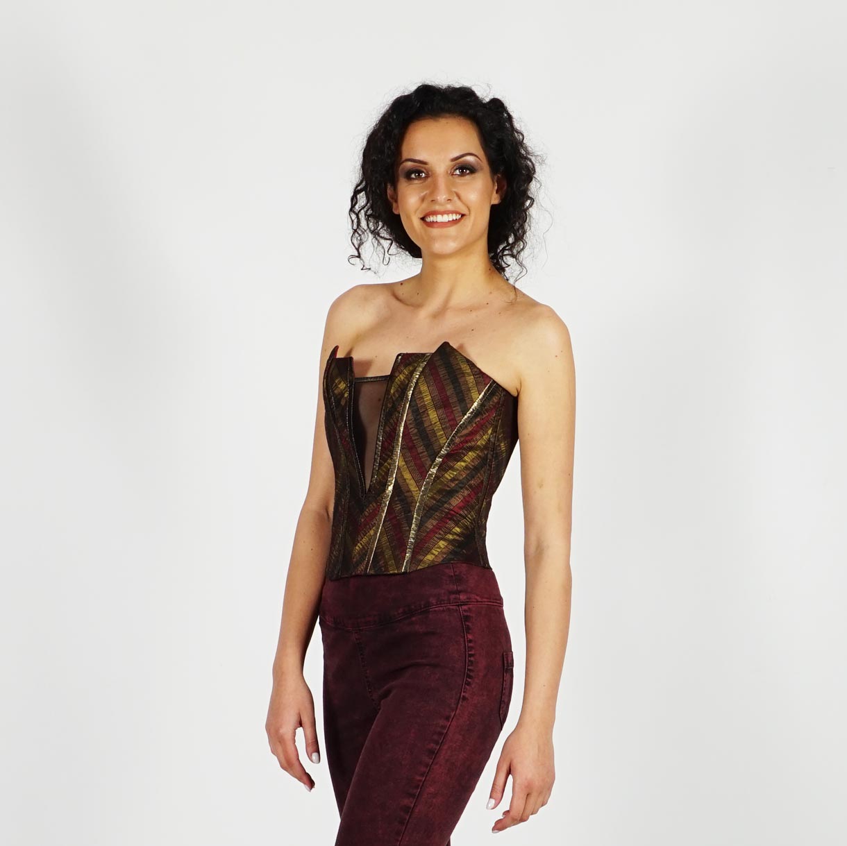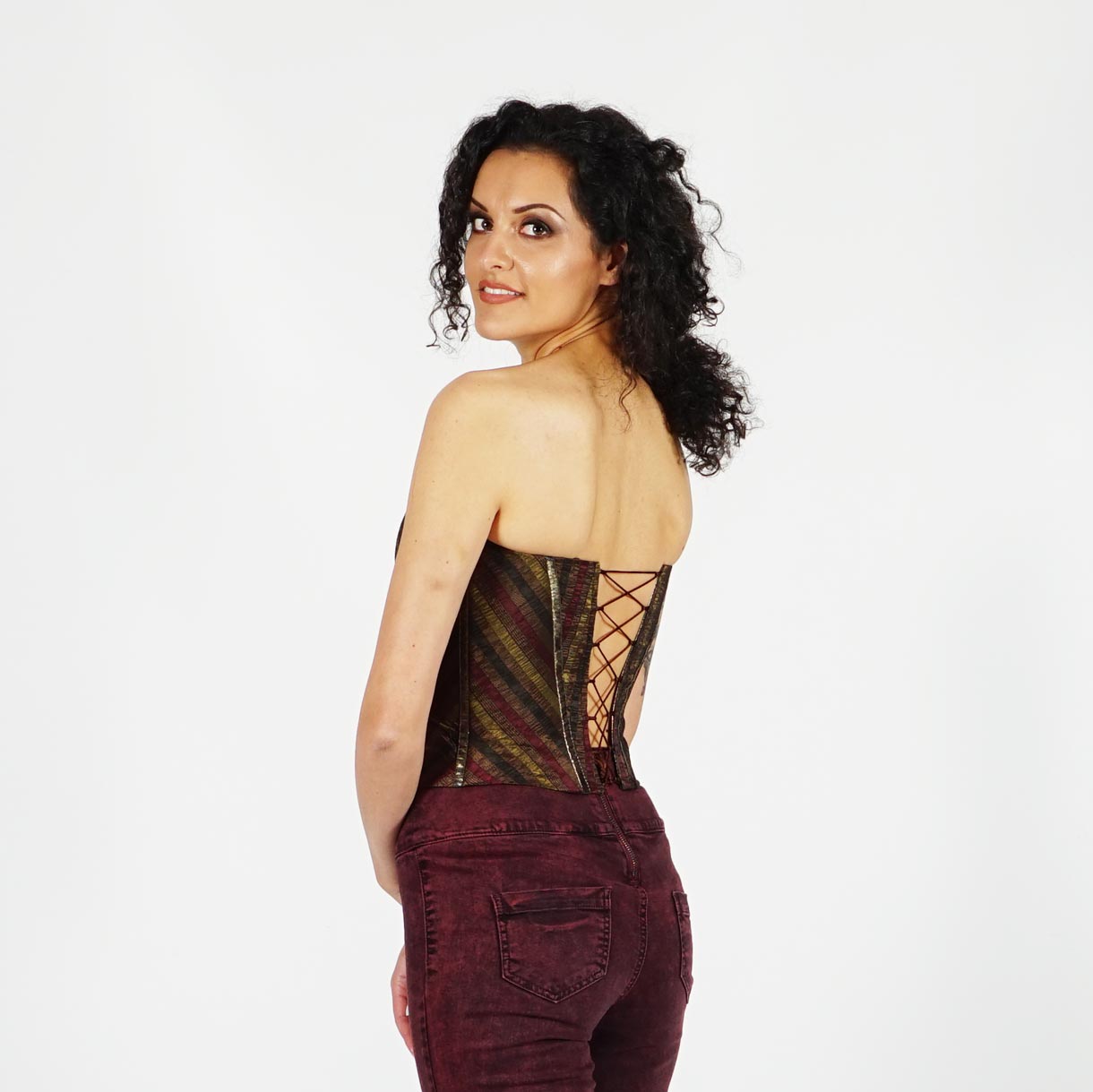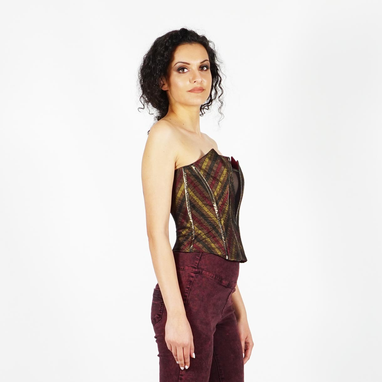 Официален дамски бутиков корсет в златисто кафяво и бордо на райе 50022К