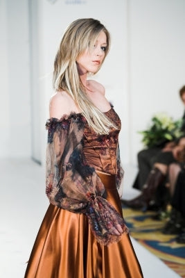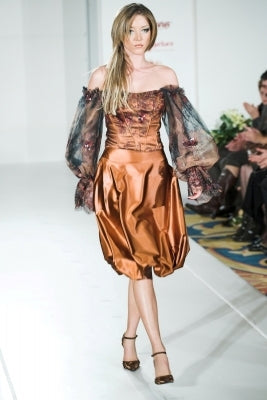 Официалният дамски се състои от сатенена пола балон и корсет с богати дантелени буфан ръкави, които оголват сексапилно рамената. Дантелата е бутиков италиански тюл с нежна бродерия и пайети в нюанси на керемида. Цветът на сатенената дамска пола е светло керемидено кафяв. А материята е с матиран блясък, мекота на допир и падане и комфортна еластичност. Корсетът като изделие е не само много сексапилен, но и прилягащ на фигурата благодарение на регулацията с връзките. Има подвижни подплънки, които подчертават и уголемяват бюста при необходимост!