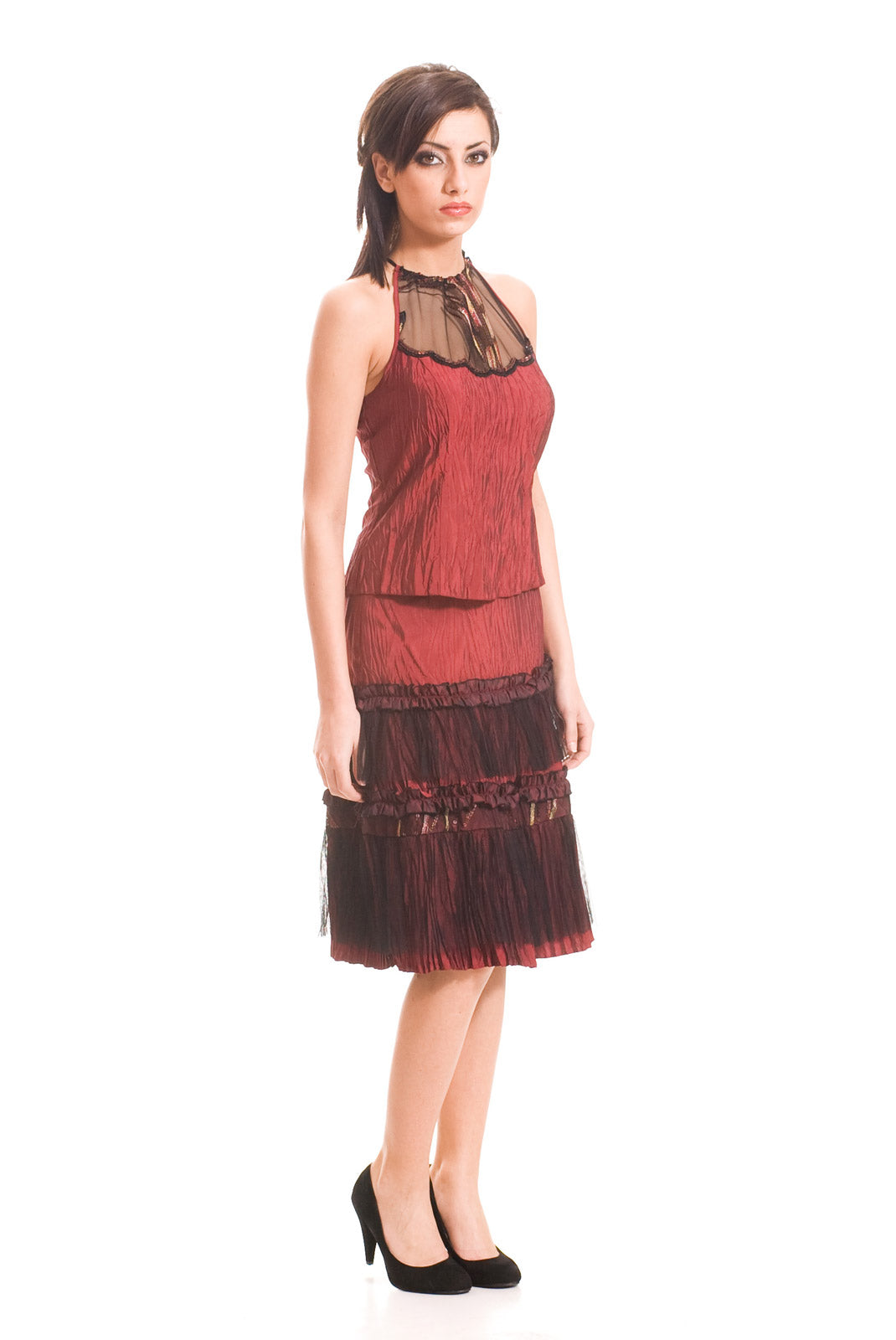 Официален дамски сет от корсаж и пола в бордо с черен тюл с бродерия. Основната материя е тафта с фризе ефект в бордо. Дамската пола е от тафта с украса черен тюл. Дамският корсаж е от тафтата в комбинация с луксозен черен италиански тюл с бродерия.