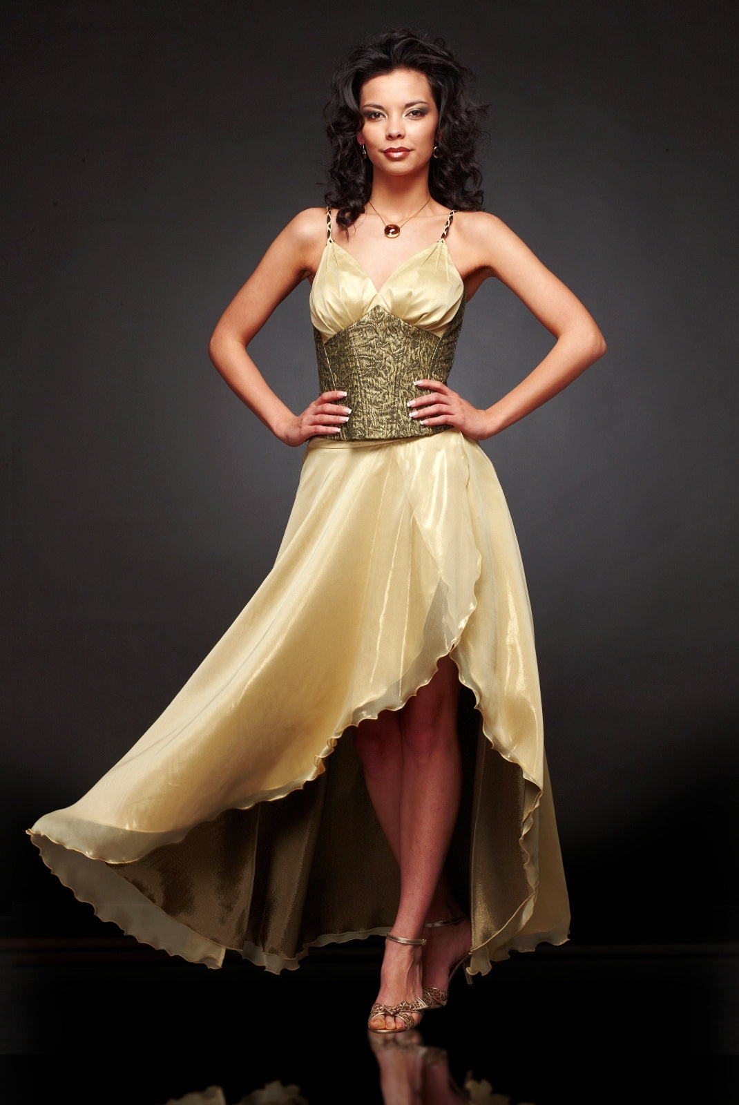 Официален дамски сет от корсет и дълга пола в жълто и златно 50027