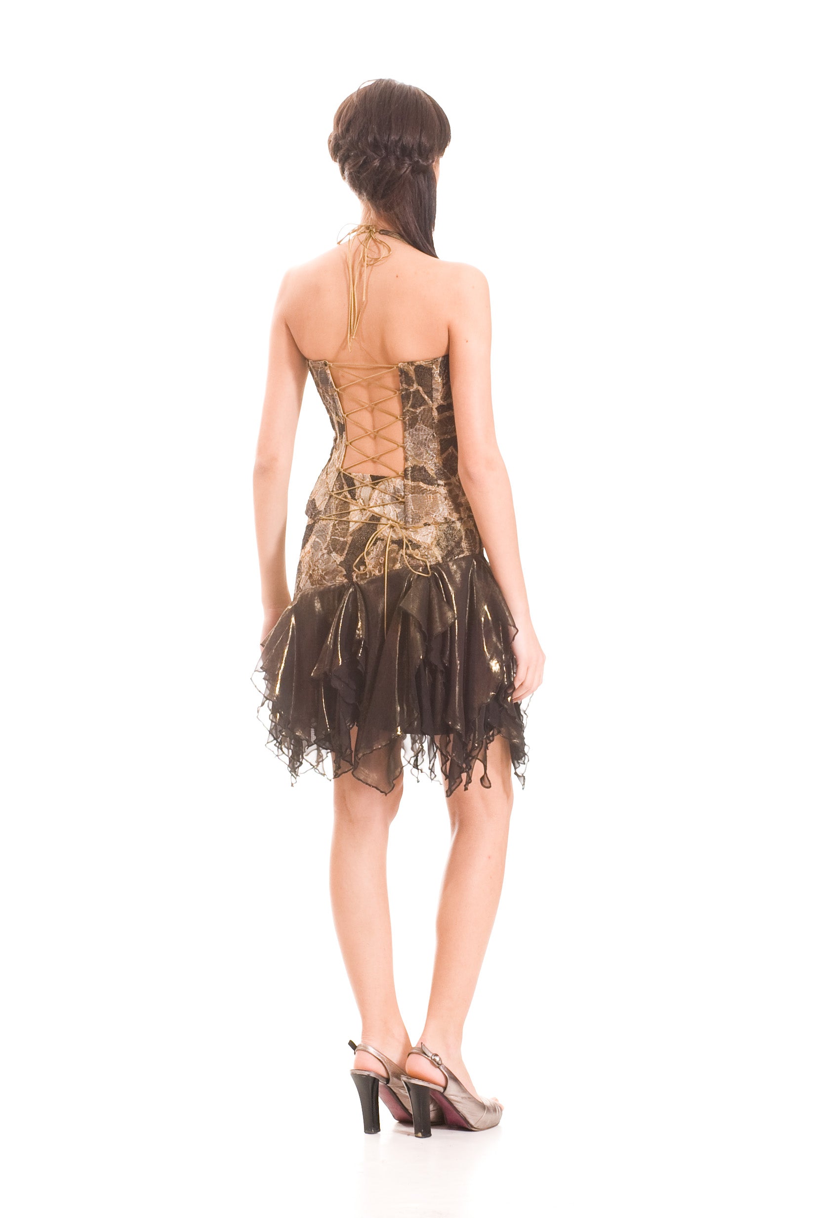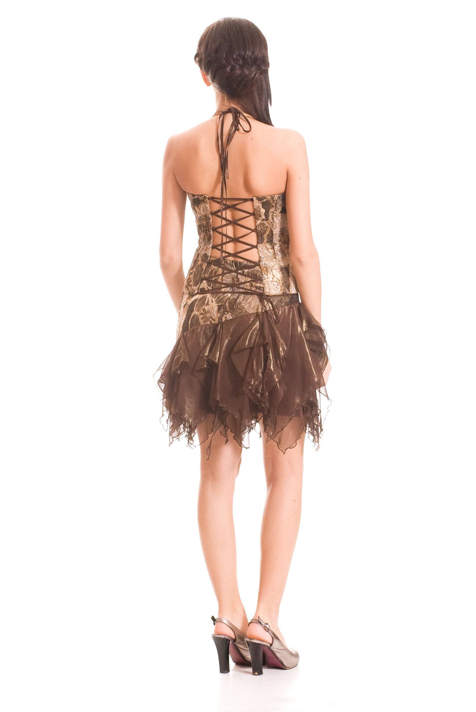 Официален  дамски сет от корсет и къса пола от дантела и органза. Полата е ефирна с оригинално ефектно обемно и секси раздвижване в долната част. Корсетът е изработен от италианска бутикова дантела и органза. Връзките на гърба позволяват регулиране на корсета. Има подвижни подплънки спомагащи за повдигане и уголемяване на бюста.