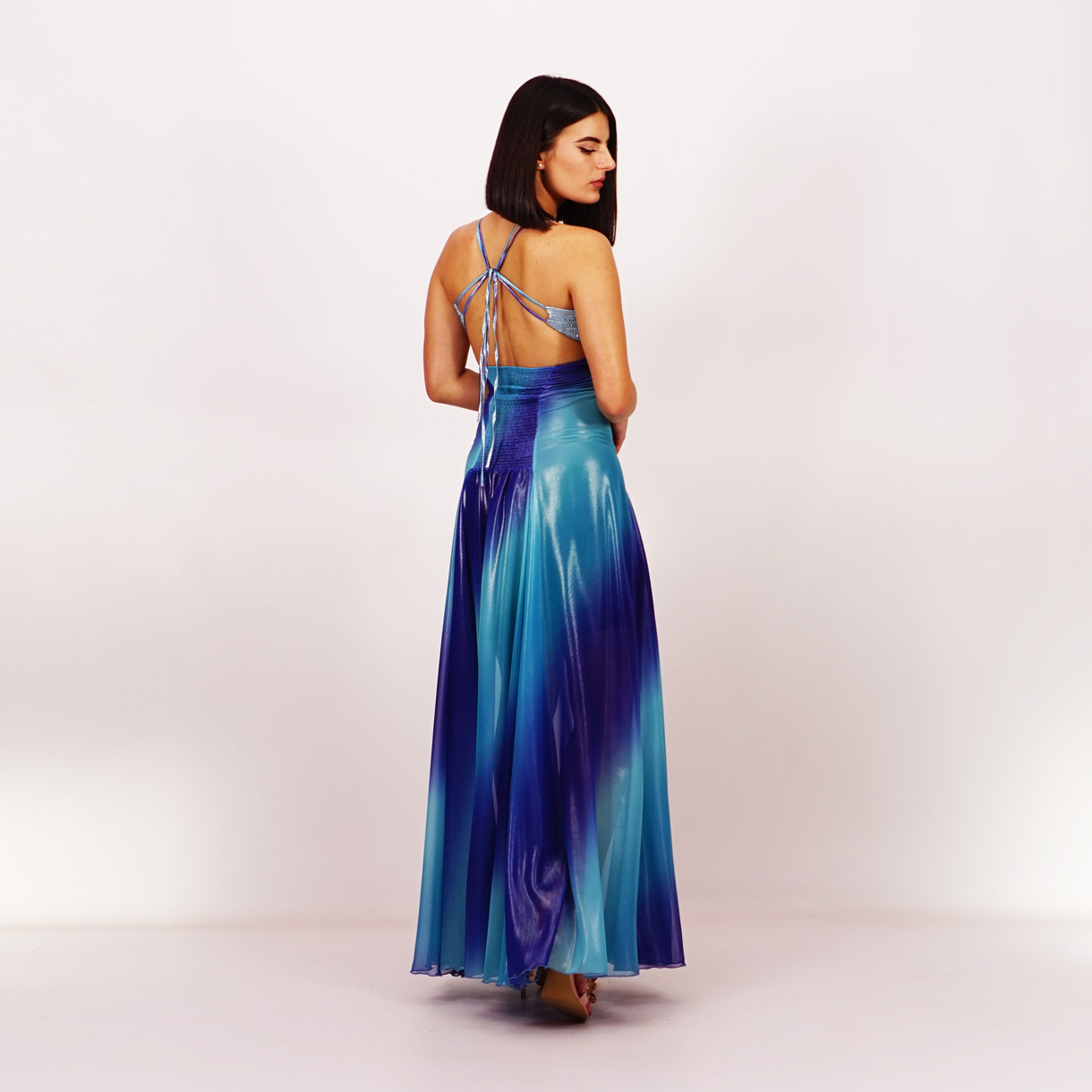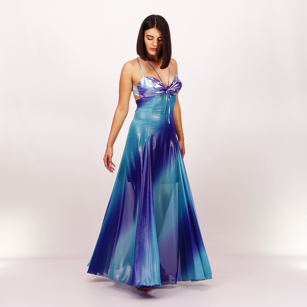 Една уникална дамска рокля - бижу - от бутиков италиански шифон в преливащи сини нюанси. Шифонът е с лека деликатна секси прозирност с блестящо официално покритие! Дамската рокля е с къса подплата, която е над коляното и дава възможност да се очертават и виждат красивите извивки на краката! Роклята е с гол гръб, но в същото време стои много стабилно на бюста и може да се носи без сутиен дори и при голям бюст заради вградените регулации - ластични долни презрамки при гърба и начина на връзване и регулиращо пристягане! Връзката при деколтето също има регулиращ ефект за големината му според това колко пристягаме връзката. Има и подвижни подплънки, които да се използват според големината на бюста!