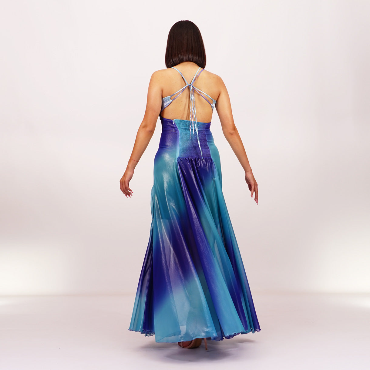 Официална бутикова дълга дамска рокля от шифон в преливащи сини нюанси 20213 С