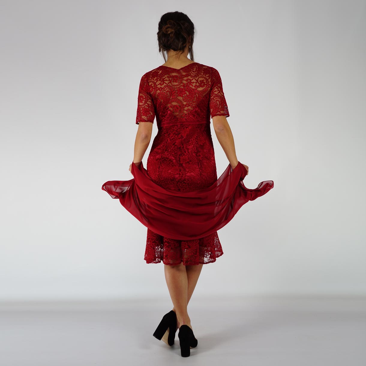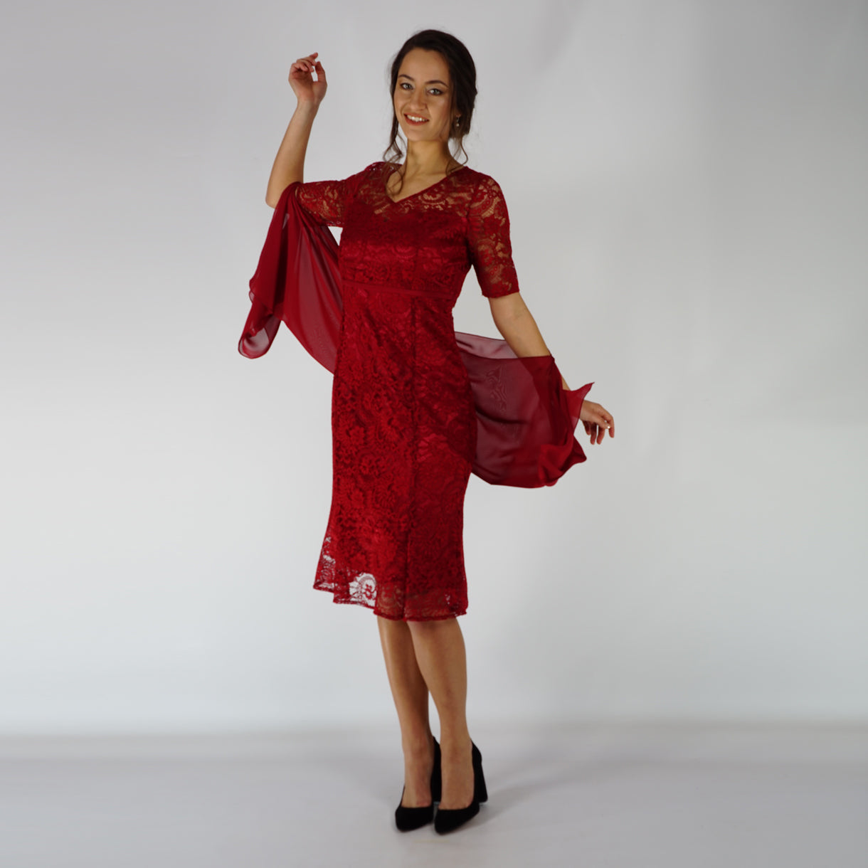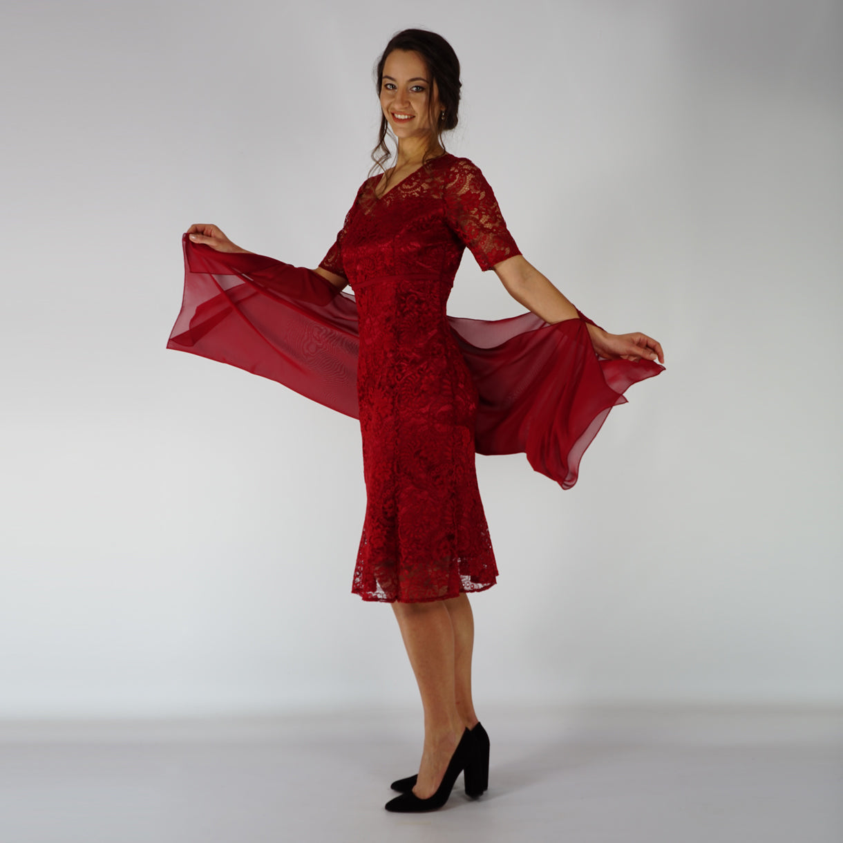 Официална дантелена кралско червена дамска рокля с ръкави 20723