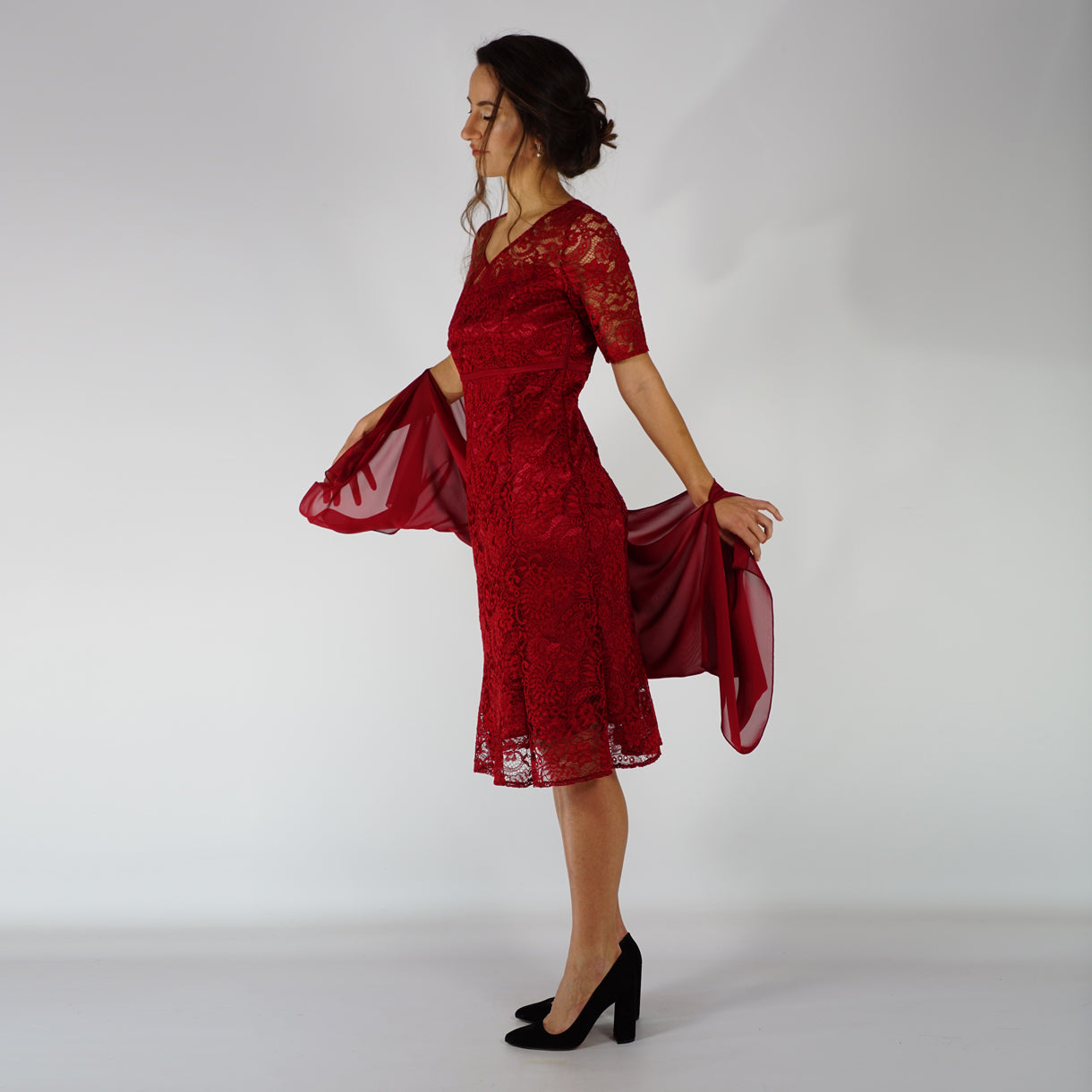 За вашите тържествени събития е това бижу от италианска дантела в кралско червено. Хастарът е от червен еластичен луксозен сатен. Лъскавината на сатена под дантелата подчертава красивата и орнаментика . Дантелените ръкави прикриват деликатните зони като в същото време прозират красиво върху кожата. Същият ефект имаме и при деколтето при предницата и гърба, където v-образната форма е още един ефектен акцент. Цената на шала е 35лв. и не е включена в обявената цена. Шалът е от ефирен шифон в кралско червено.